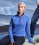 J-America Ladies Omega Stretch 1/4 Zip. 8 ounce, 51% Rayon, 43% Polyester, 6% Elastine stretch & sueded triblend terry. 4-way stretch fabric with striped loop back yarns. Set-in sleeves. Self fabric collar, waist, & cuffs. Side gusset & hand pockets. Thumbhole cuffs