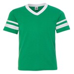 Augusta Youth 4.8 Ounces Poly/Cotton Stripe Sleeve Jerseys. 4.8 ounce, 50/50 polyester/cotton jersey knit fabric with contrast color v-neck collar and sleeve stripes. Set-in-sleeves. Ships from Grovetown, GA.